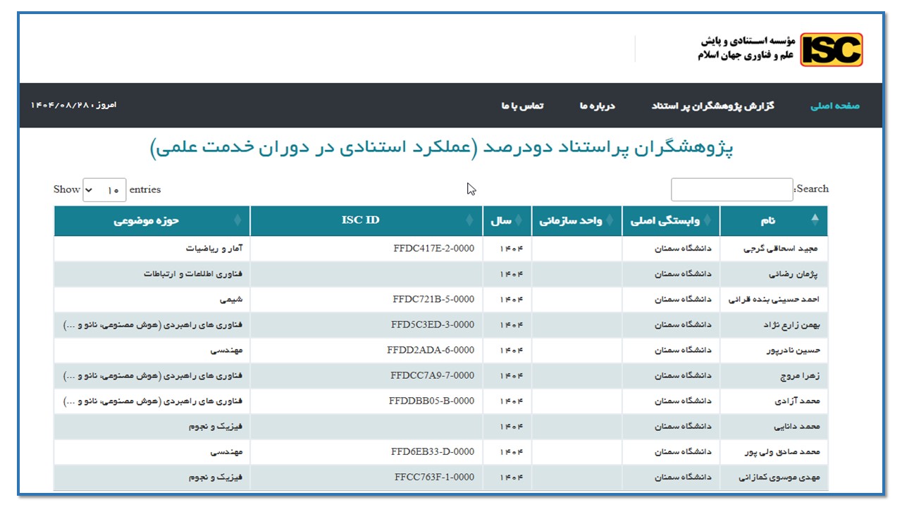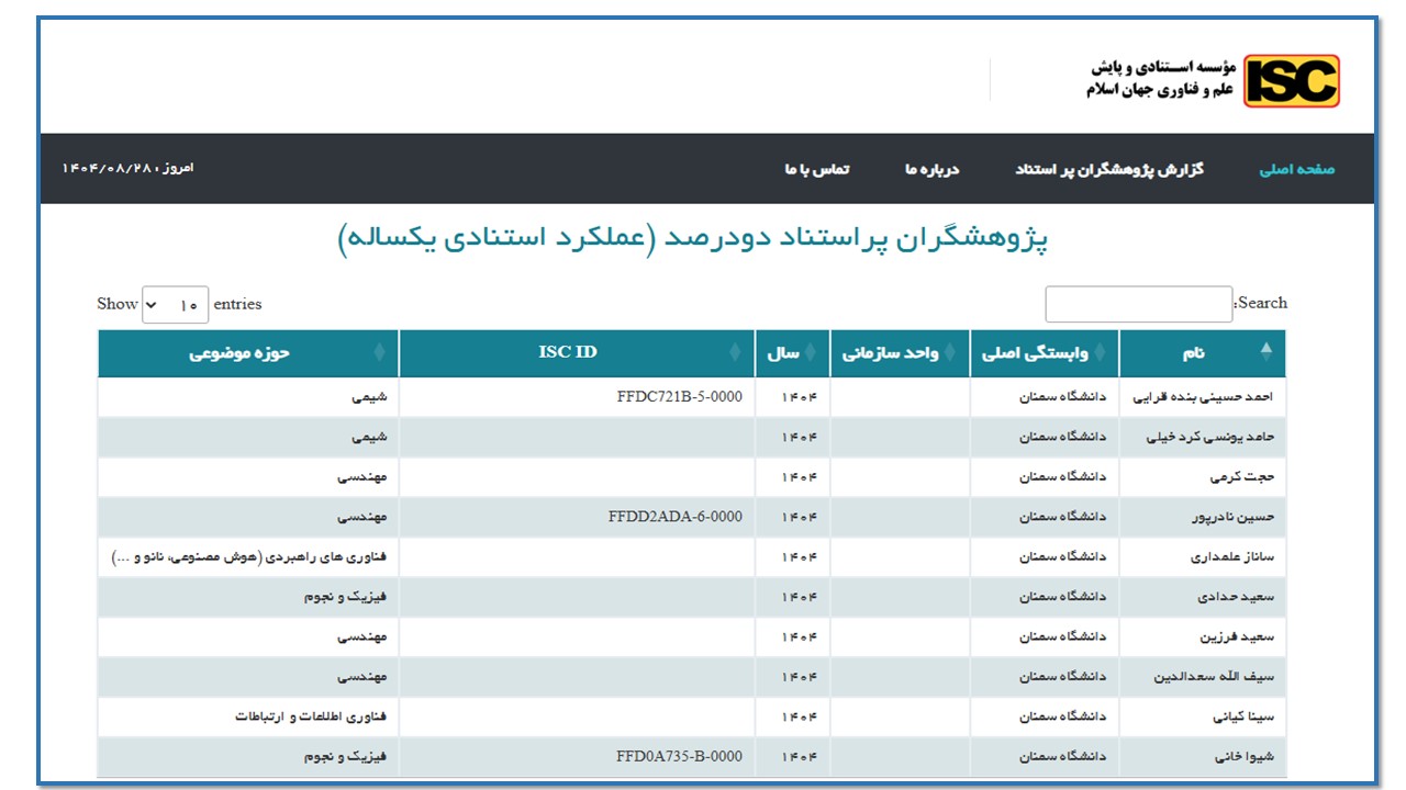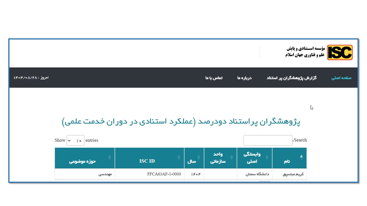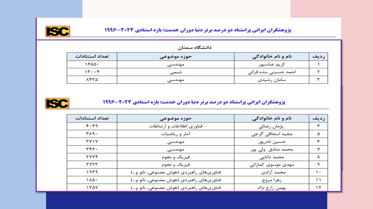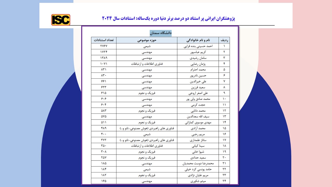 According to Semnan University Public Relations, Dr. Mohammad Hossein Ehsani announced the news: In the latest update of the ISC database, which was recently published, 26 researchers from Semnan University have been included in the list of the top two percent of highly cited researchers in the world. This list is based on one-year citation performance in 2024 as well as an analysis of the citation performance of authors during their academic careers from 1960 to 2024.